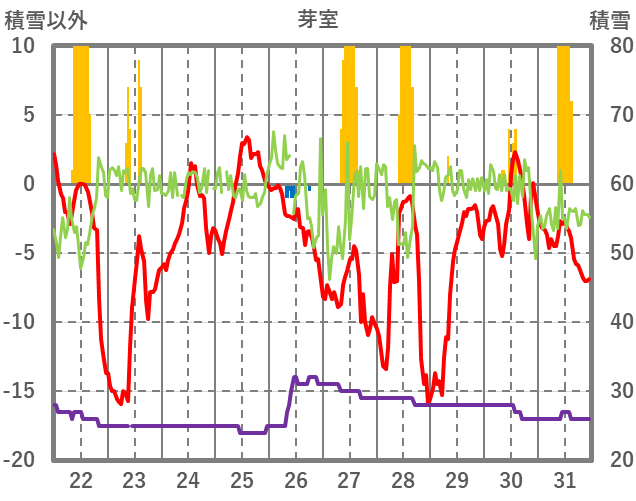 | 日 | 時 | 気温 | 降水 | 風向/風速 | 日照 | 積雪 | 降雪 |
