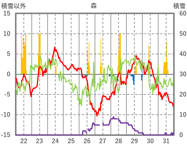 | 日 | 時 | 気温 | 降水 | 風向/風速 | 日照 | 積雪 | 降雪 |
