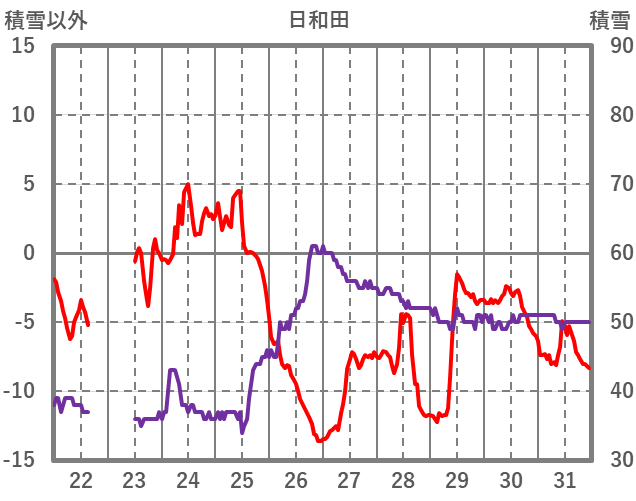 | 日 | 時 | 気温 | 降水 | 風向/風速 | 日照 | 積雪 | 降雪 |