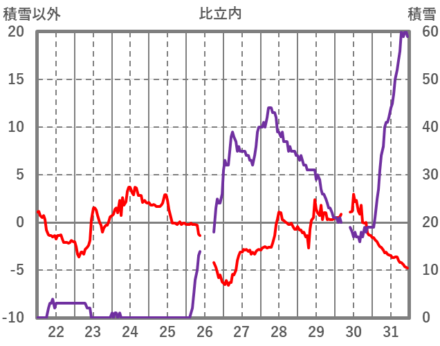 | 日 | 時 | 気温 | 降水 | 風向/風速 | 日照 | 積雪 | 降雪 |