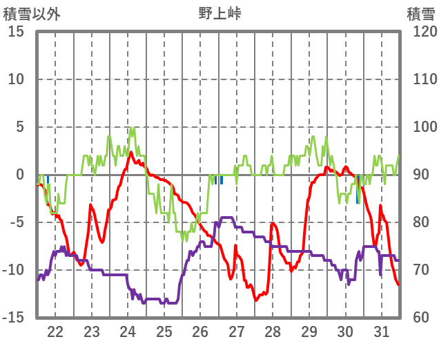 | 日 | 時 | 気温 | 降水 | 風向/風速 | 日照 | 積雪 | 降雪 |