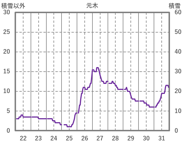 | 日 | 時 | 気温 | 降水 | 風向/風速 | 日照 | 積雪 | 降雪 |