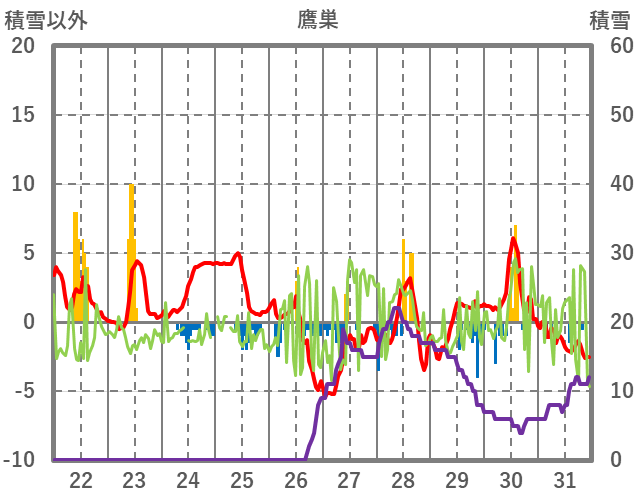 | 日 | 時 | 気温 | 降水 | 風向/風速 | 日照 | 積雪 | 降雪 |