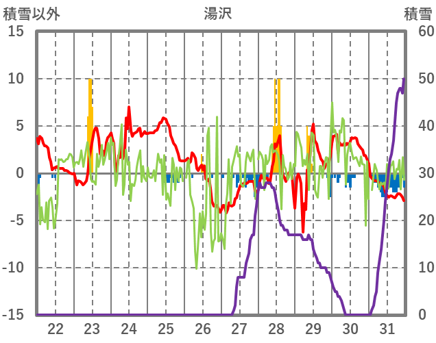 | 日 | 時 | 気温 | 降水 | 風向/風速 | 日照 | 積雪 | 降雪 |