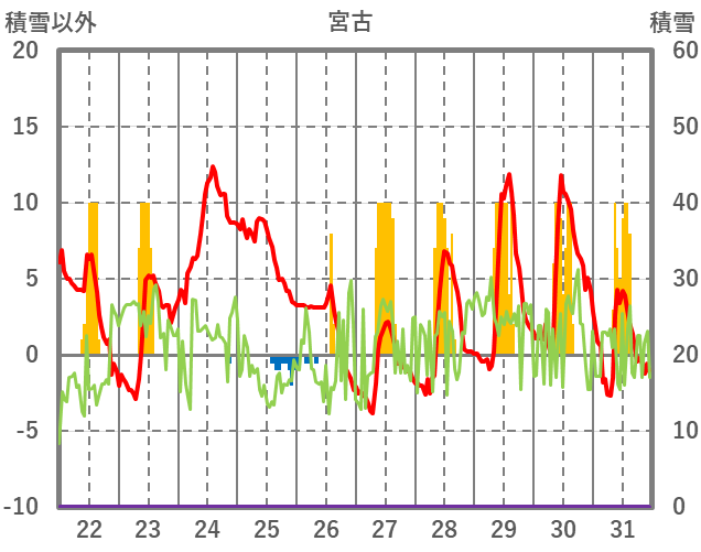| 日 | 時 | 気温 | 降水 | 風向/風速 | 日照 | 積雪 | 降雪 |