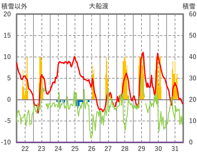 | 日 | 時 | 気温 | 降水 | 風向/風速 | 日照 | 積雪 | 降雪 |