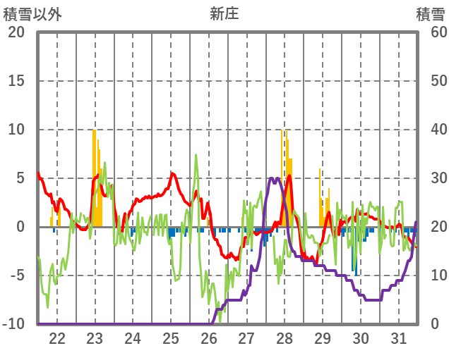 | 日 | 時 | 気温 | 降水 | 風向/風速 | 日照 | 積雪 | 降雪 |