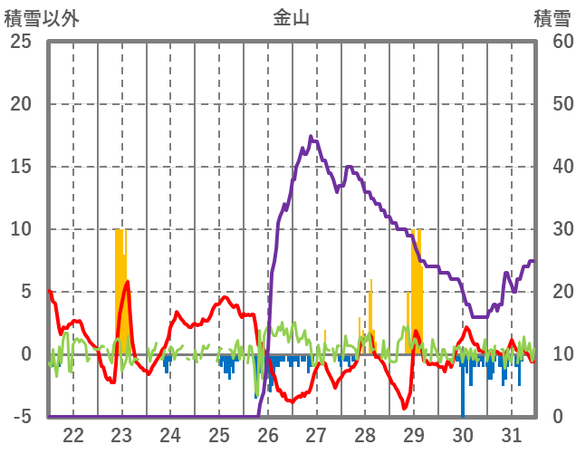 | 日 | 時 | 気温 | 降水 | 風向/風速 | 日照 | 積雪 | 降雪 |