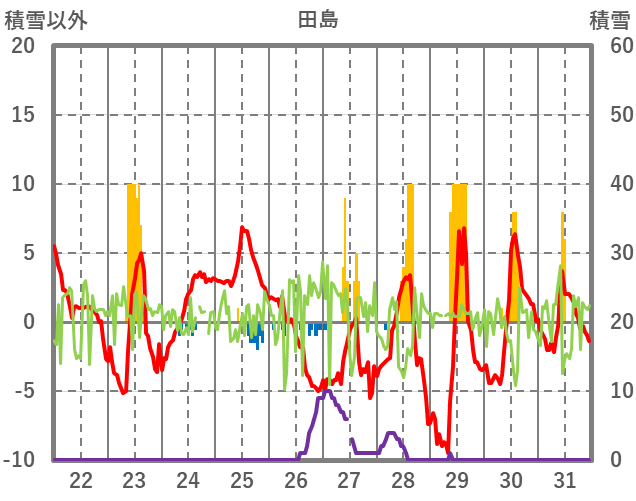 | 日 | 時 | 気温 | 降水 | 風向/風速 | 日照 | 積雪 | 降雪 |