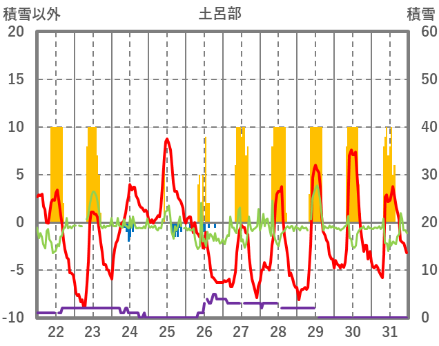 | 日 | 時 | 気温 | 降水 | 風向/風速 | 日照 | 積雪 | 降雪 |