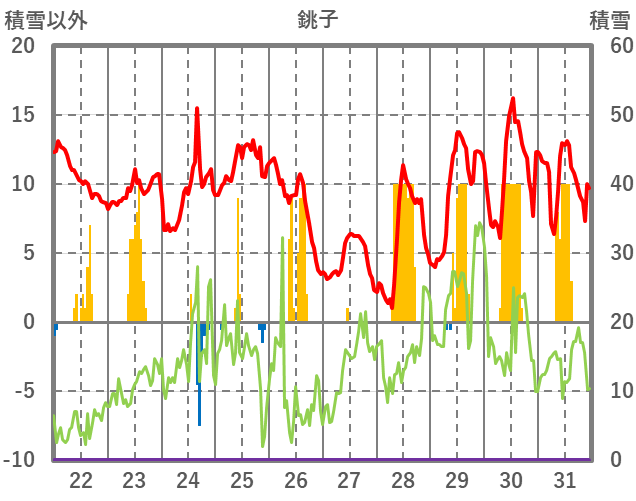 | 日 | 時 | 気温 | 降水 | 風向/風速 | 日照 | 積雪 | 降雪 |