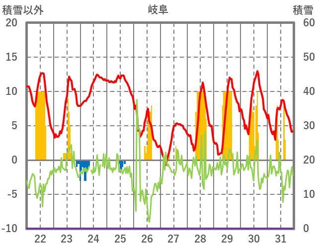 | 日 | 時 | 気温 | 降水 | 風向/風速 | 日照 | 積雪 | 降雪 |