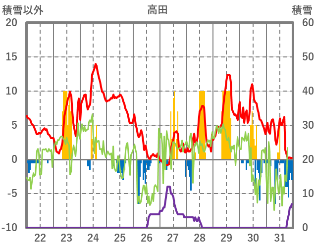| 日 | 時 | 気温 | 降水 | 風向/風速 | 日照 | 積雪 | 降雪 |