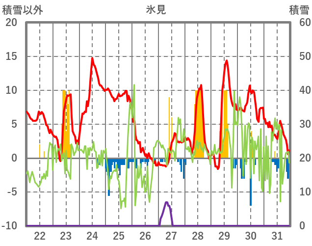 | 日 | 時 | 気温 | 降水 | 風向/風速 | 日照 | 積雪 | 降雪 |