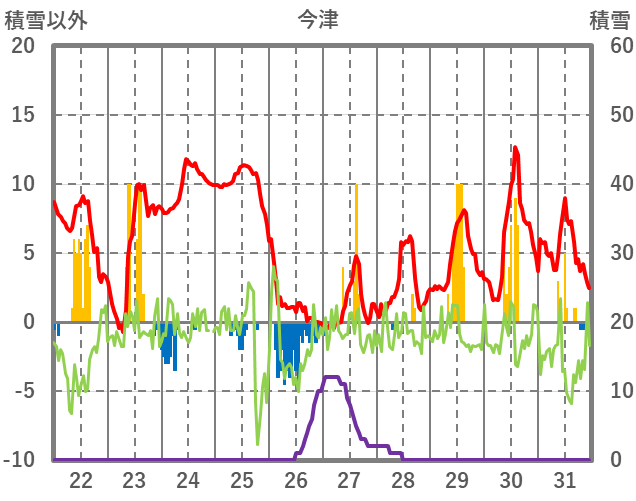 | 日 | 時 | 気温 | 降水 | 風向/風速 | 日照 | 積雪 | 降雪 |