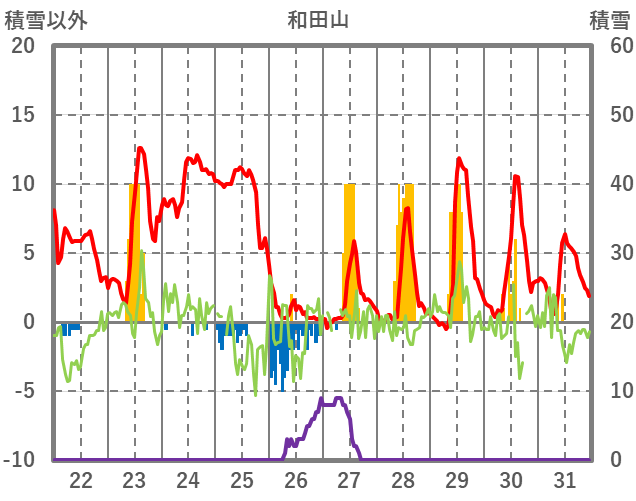 | 日 | 時 | 気温 | 降水 | 風向/風速 | 日照 | 積雪 | 降雪 |