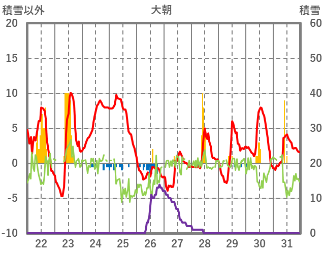 | 日 | 時 | 気温 | 降水 | 風向/風速 | 日照 | 積雪 | 降雪 |