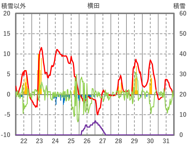 | 日 | 時 | 気温 | 降水 | 風向/風速 | 日照 | 積雪 | 降雪 |