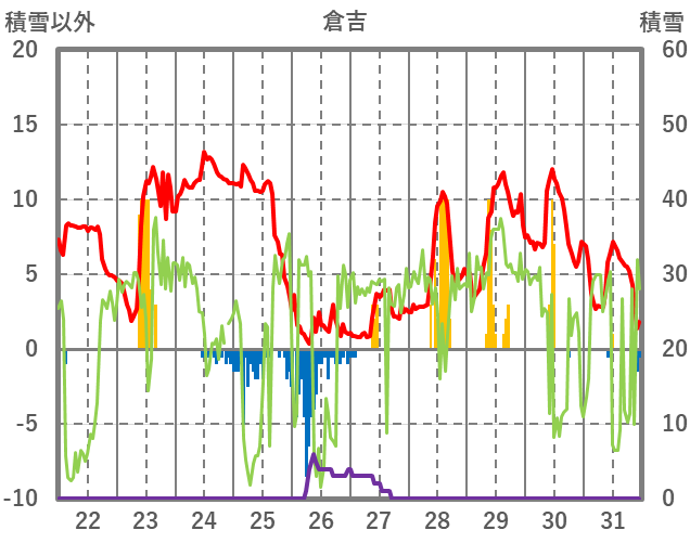 | 日 | 時 | 気温 | 降水 | 風向/風速 | 日照 | 積雪 | 降雪 |
