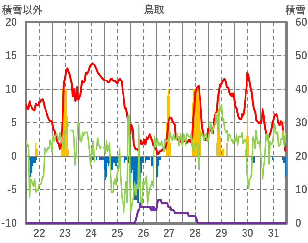 | 日 | 時 | 気温 | 降水 | 風向/風速 | 日照 | 積雪 | 降雪 |