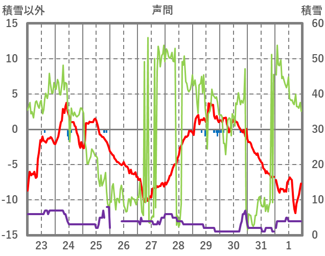 | 日 | 時 | 気温 | 降水 | 風向/風速 | 日照 | 積雪 | 降雪 |