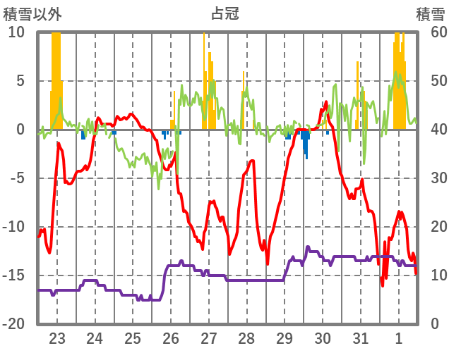 | 日 | 時 | 気温 | 降水 | 風向/風速 | 日照 | 積雪 | 降雪 |