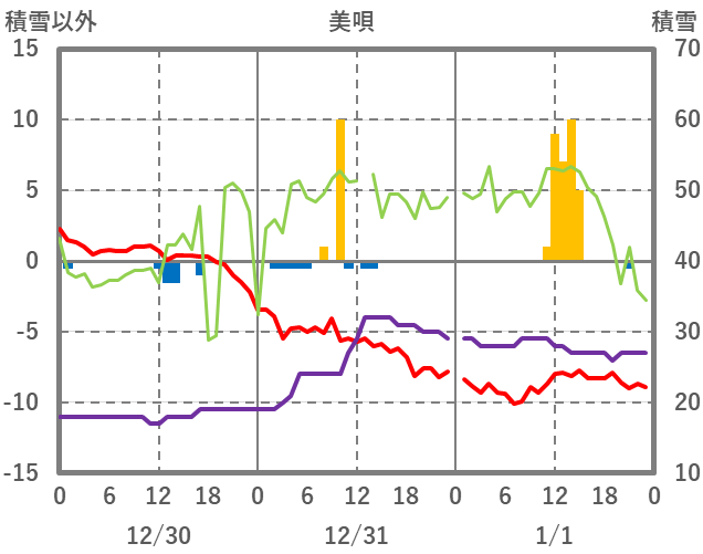 | 日 | 時 | 気温 | 降水 | 風向/風速 | 日照 | 積雪 | 降雪 |