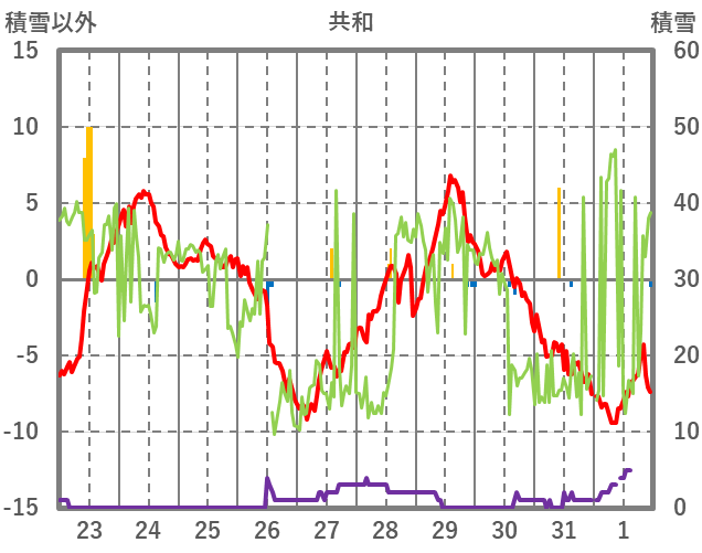 | 日 | 時 | 気温 | 降水 | 風向/風速 | 日照 | 積雪 | 降雪 |
