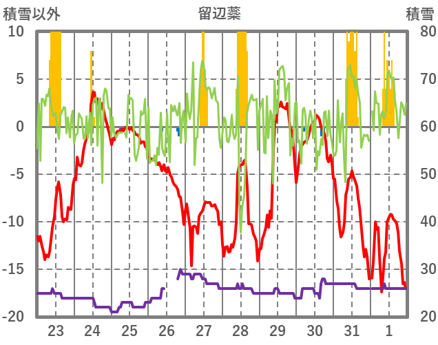 | 日 | 時 | 気温 | 降水 | 風向/風速 | 日照 | 積雪 | 降雪 |
