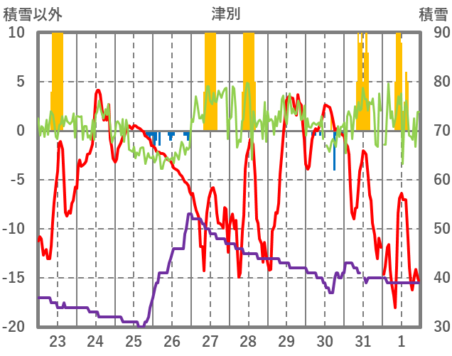 | 日 | 時 | 気温 | 降水 | 風向/風速 | 日照 | 積雪 | 降雪 |