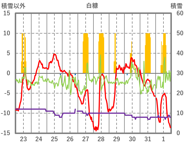| 日 | 時 | 気温 | 降水 | 風向/風速 | 日照 | 積雪 | 降雪 |