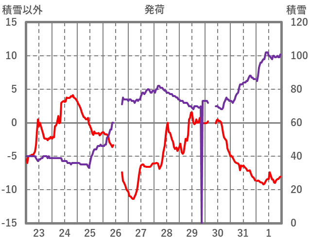 | 日 | 時 | 気温 | 降水 | 風向/風速 | 日照 | 積雪 | 降雪 |