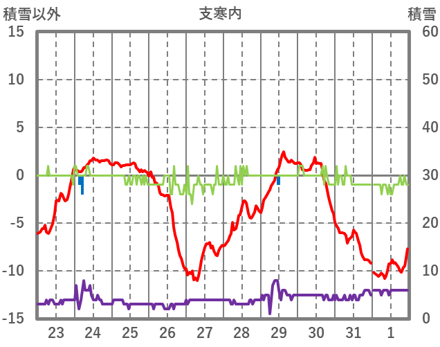 | 日 | 時 | 気温 | 降水 | 風向/風速 | 日照 | 積雪 | 降雪 |