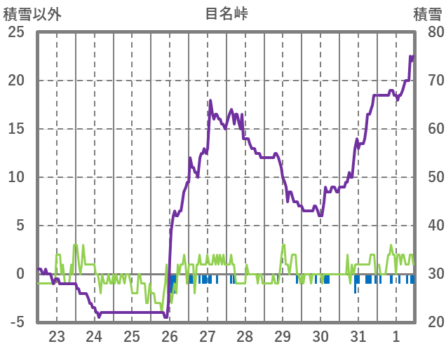 | 日 | 時 | 気温 | 降水 | 風向/風速 | 日照 | 積雪 | 降雪 |