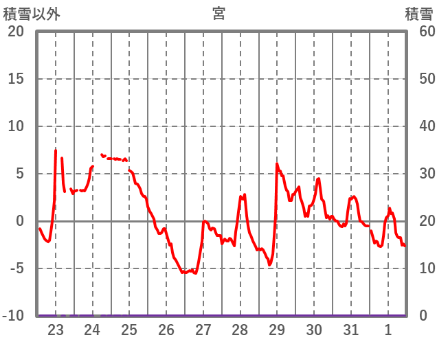 | 日 | 時 | 気温 | 降水 | 風向/風速 | 日照 | 積雪 | 降雪 |