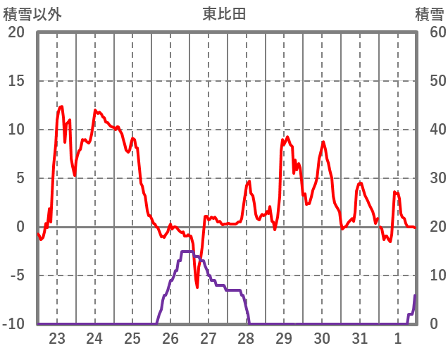 | 日 | 時 | 気温 | 降水 | 風向/風速 | 日照 | 積雪 | 降雪 |