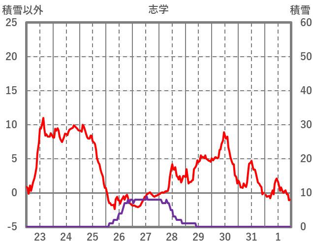 | 日 | 時 | 気温 | 降水 | 風向/風速 | 日照 | 積雪 | 降雪 |