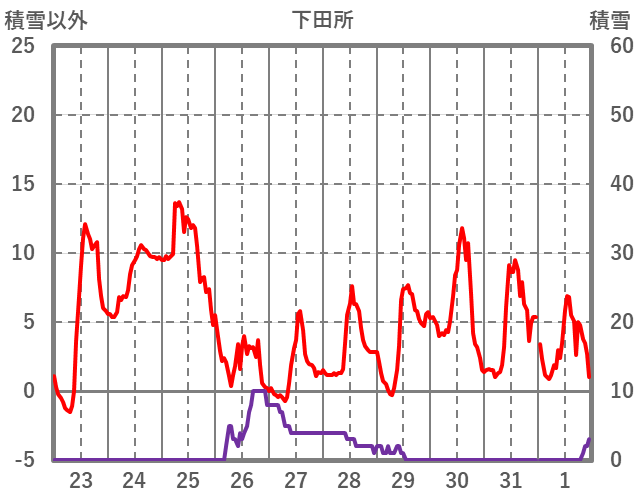 | 日 | 時 | 気温 | 降水 | 風向/風速 | 日照 | 積雪 | 降雪 |
