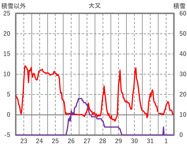| 日 | 時 | 気温 | 降水 | 風向/風速 | 日照 | 積雪 | 降雪 |