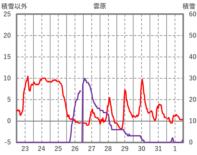 | 日 | 時 | 気温 | 降水 | 風向/風速 | 日照 | 積雪 | 降雪 |