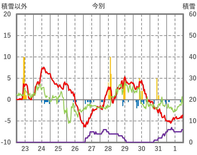 | 日 | 時 | 気温 | 降水 | 風向/風速 | 日照 | 積雪 | 降雪 |
