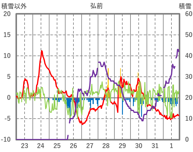| 日 | 時 | 気温 | 降水 | 風向/風速 | 日照 | 積雪 | 降雪 |