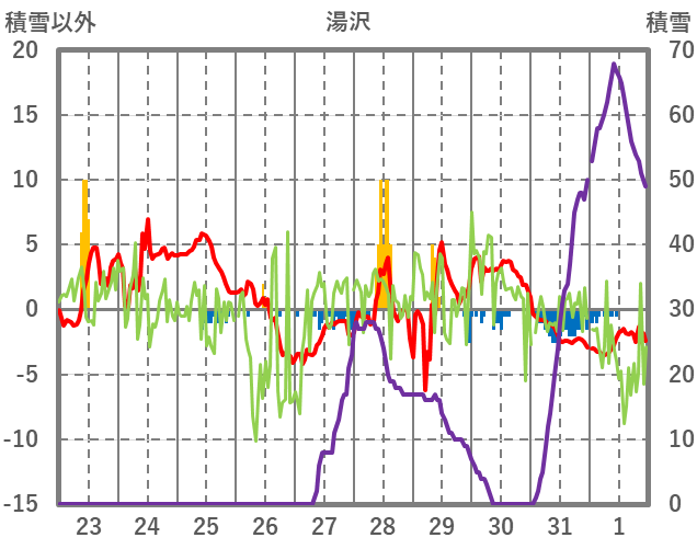 | 日 | 時 | 気温 | 降水 | 風向/風速 | 日照 | 積雪 | 降雪 |