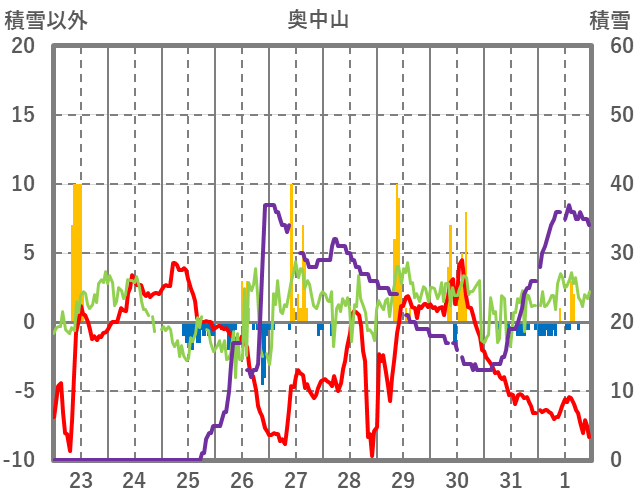 | 日 | 時 | 気温 | 降水 | 風向/風速 | 日照 | 積雪 | 降雪 |
