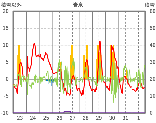 | 日 | 時 | 気温 | 降水 | 風向/風速 | 日照 | 積雪 | 降雪 |