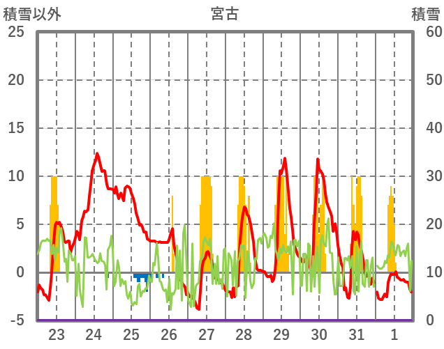 | 日 | 時 | 気温 | 降水 | 風向/風速 | 日照 | 積雪 | 降雪 |