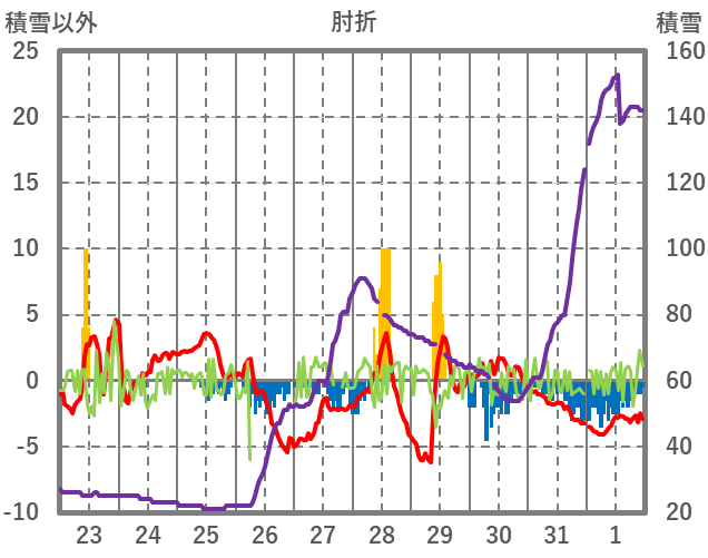 | 日 | 時 | 気温 | 降水 | 風向/風速 | 日照 | 積雪 | 降雪 |
