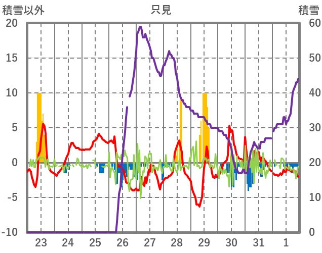 | 日 | 時 | 気温 | 降水 | 風向/風速 | 日照 | 積雪 | 降雪 |