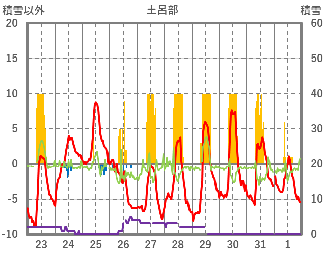 | 日 | 時 | 気温 | 降水 | 風向/風速 | 日照 | 積雪 | 降雪 |