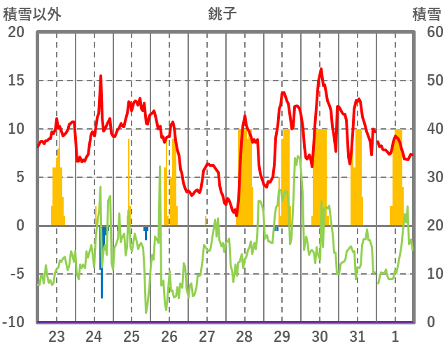 | 日 | 時 | 気温 | 降水 | 風向/風速 | 日照 | 積雪 | 降雪 |